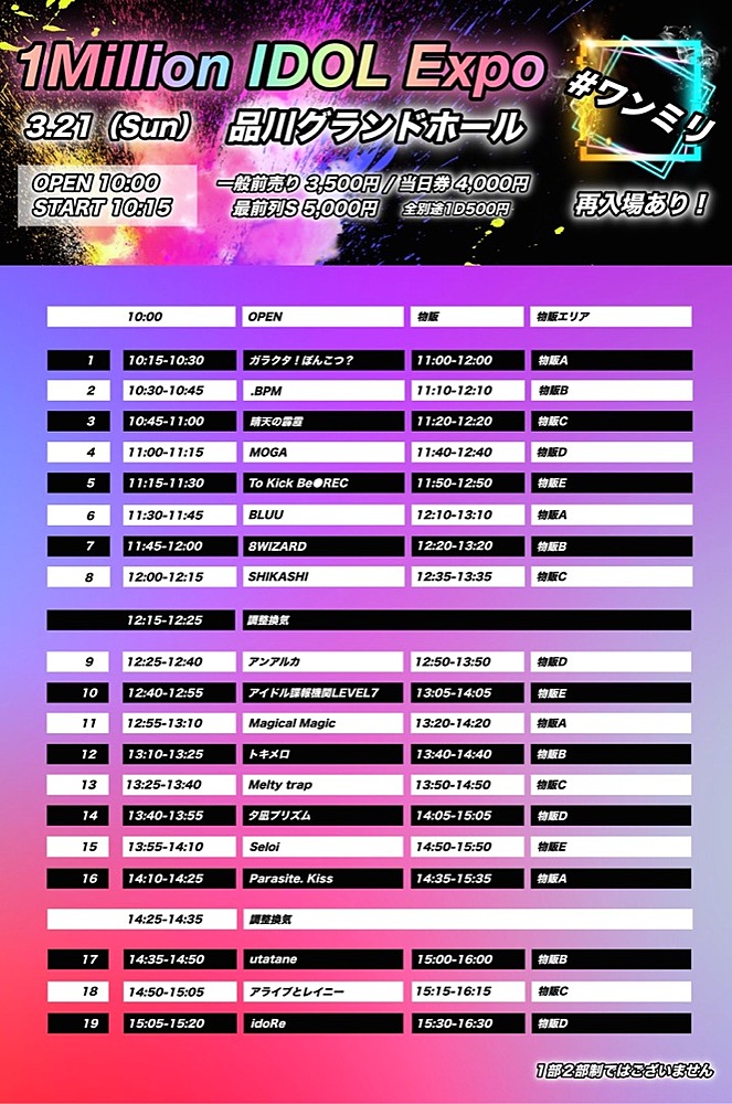 1Million IDOL EXPO #ワンミリ LIVE/EVENT 2021/03/21(日) 10:30 - 20:00 品川グランドホール LIVE▶10:30~ 物販▶11:10~ OPEN 10:00 START 10:15 前売 3,500円/当日 4,000円/最前S 5,000円 チケット(2/27土 12時~) URLをコピーする 報告する
