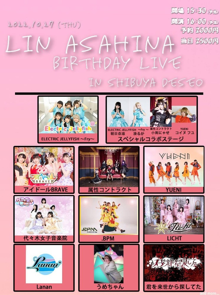 LIN ASAHINA BIRTHDAY LIVE LIVE/EVENT 2022/10/27(木) 18:50 - 22:00 SHIBUYA DESEO 開場 16:45 開演 17:05 LIVE▶18:50〜 物販▶19:25〜 🎫チケット 予約2,000円 / 当日2,500円(1D別) チケット10/13(木) 21:00~ URLをコピーする 報告する