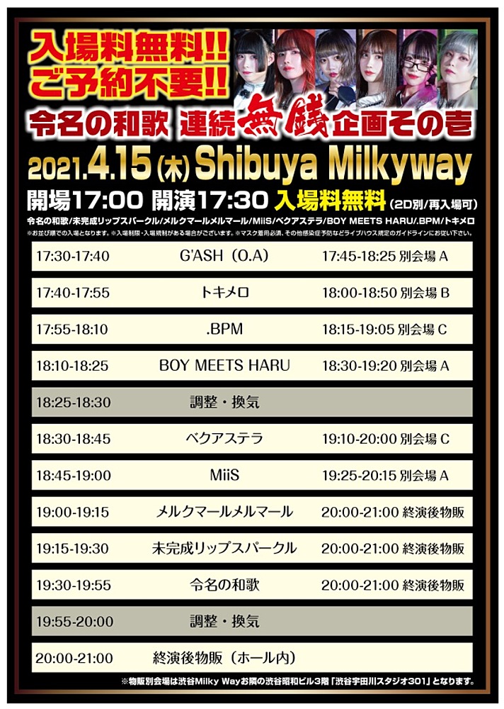 フォローLIVE▶17:55~ 物販▶18:15~(別会場C) 0円(+2D) 17:30 OPEN 18:00 START(予定) ※予約受付なし、当日受付のみ、入場制限あり!