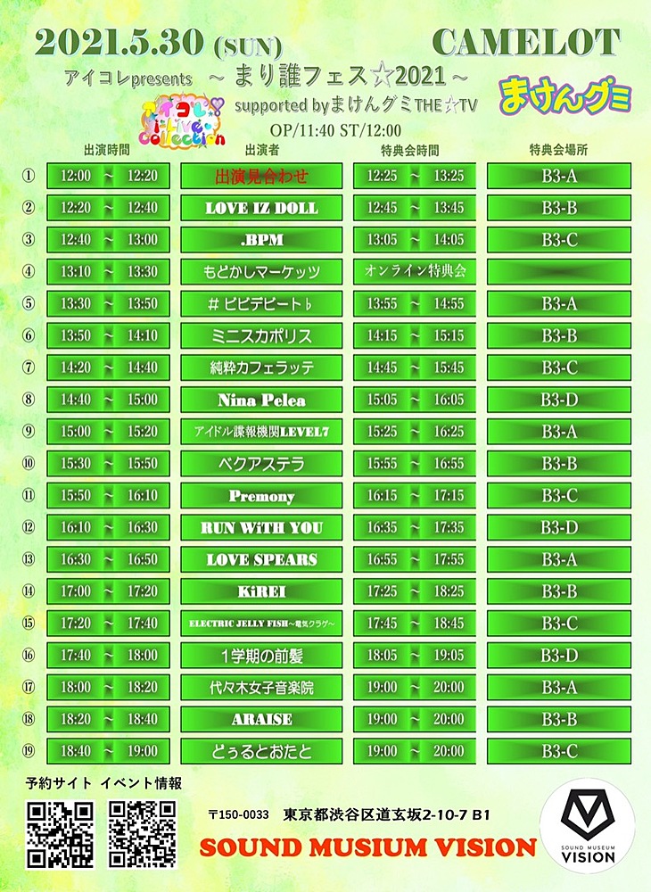 まり誰フェス☆2021@渋谷CAMELOT LIVE/EVENT 2021/05/30(日) 12:40 - 20:00 渋谷CAMELOT LIVE▶12:40~ 物販▶13:05~ 開場 11:20 / 開演 11:40 前売 : 3000円 当日券 : 3500円 チケット(5/23日 12時~) URLをコピーする 報告する