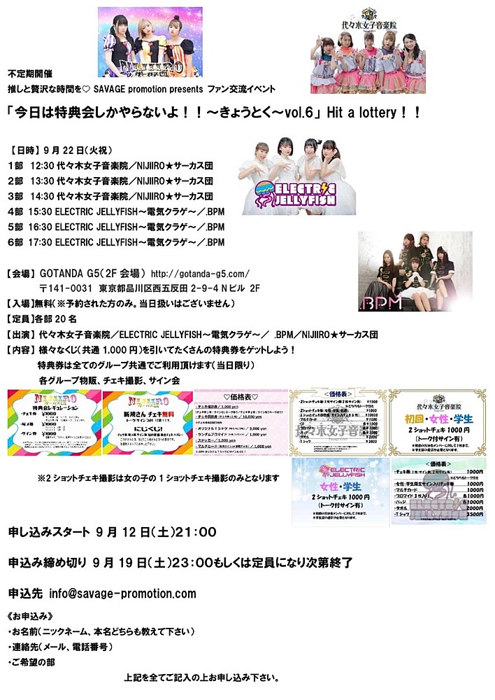 入場無料(要予約) 定員各部20名 【出演】 代々木女子音楽院/ELECTRIC JELLYFISH~電気クラゲ~/ .BPM/NIJIIRO★サーカス団 【チケット】 申込みスタート 9月12日(土)21:00 申込み締め切り 9月19日(土)23:00もしくは定員になり次第終了 予約 info@savage-promotion.com 《お申込み》 ・お名前(ニックネーム、本名どちらも教えて下さい) ・連絡先(メール、電話番号) ・ご希望の部 上記を全てご記入の上お申し込み下さい。