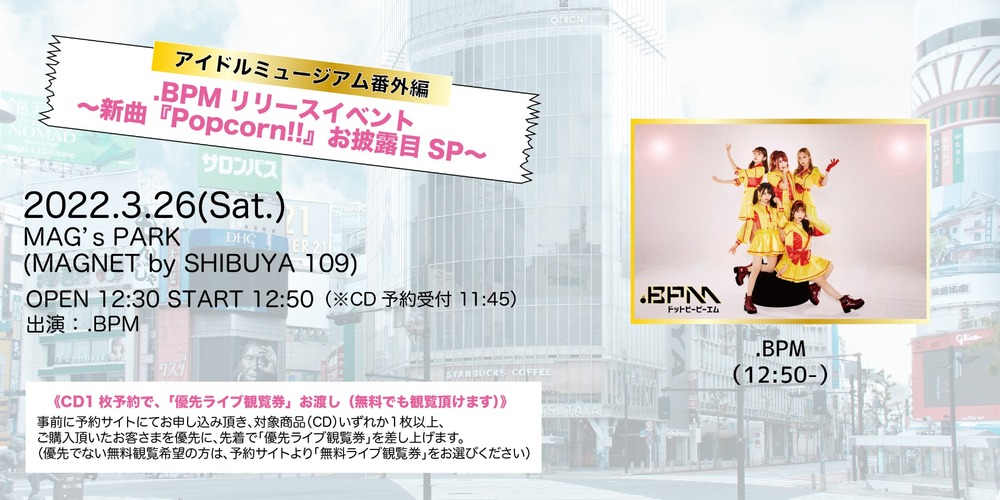 .BPM 『Dancin’ Chicken』リリースイベント〜新曲お披露目SP〜 LIVE/EVENT 2022/03/26(土) 12:30 - 14:30 MAGNET by SHIBUYA109屋上イベントスペース『MAG’sPARK』 ≪入場開始≫12:30~ ≪スタート≫12:50~ ※CD予約受付は11:45より行います。 ▼詳細はこちら https://dotbpm.bitfan.id/contents/48318 チケット3/19(土) 20:00〜 URLをコピーする 報告する
