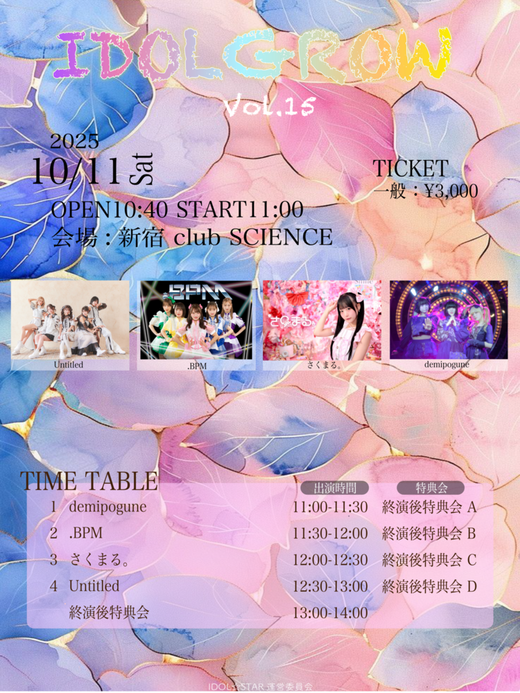 IDOLGROW vol.15 LIVE/EVENT 2025/10/11(土) 11:00 - 新宿 club SCIENCE 開場 10:40 開演 11:00 LIVE▶11:30〜 物販▶13:00〜 🎫チケット 3000円 当日券:+500円 各種+1D チケット 10/2(木)22:00〜 URLをコピーする 報告する